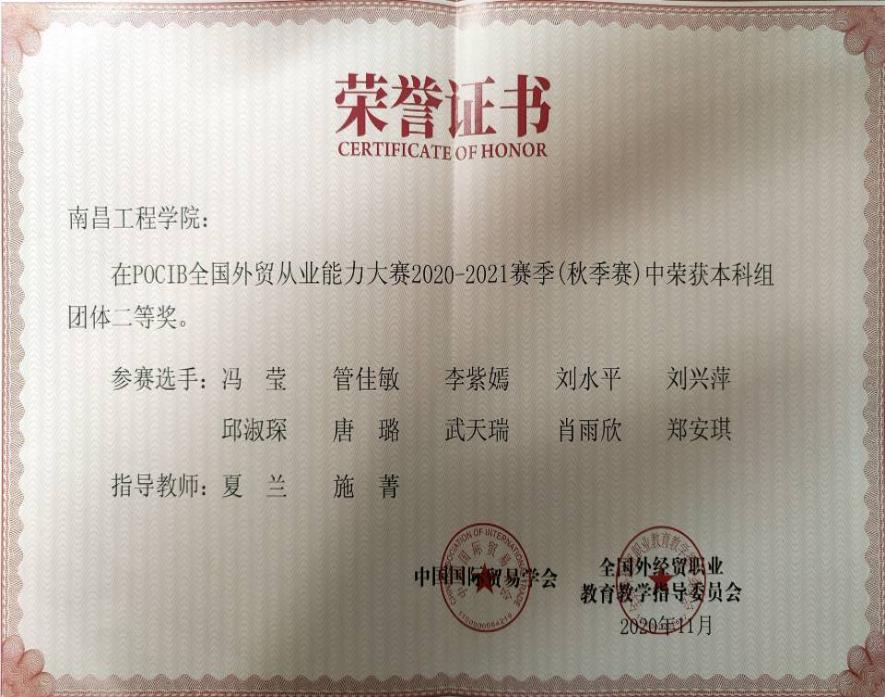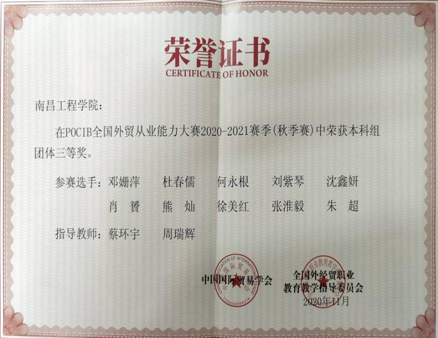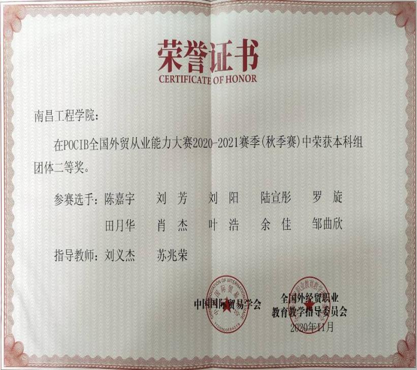 为进一步推动员工职业能力的培养与锻炼,提升员工职业能力的水平,由公司国际经济与贸易专业员工组成的三支参赛队在国贸教研室的全体老师认真指导下,于2020年10月20日-11月3日参加了第十届POCIB全国外贸从业能力大赛。近日,赛事组委会揭晓了比赛成绩,公司三支队伍全部取得优异成绩,荣获团体二等奖2项,团体三等奖1项。据悉,本届大赛共有116所本科院校287支队伍参赛。本项赛事是由中国国际贸易学会、全国外经贸职业公司产品指导委员会主办。(文/图:刘义杰)