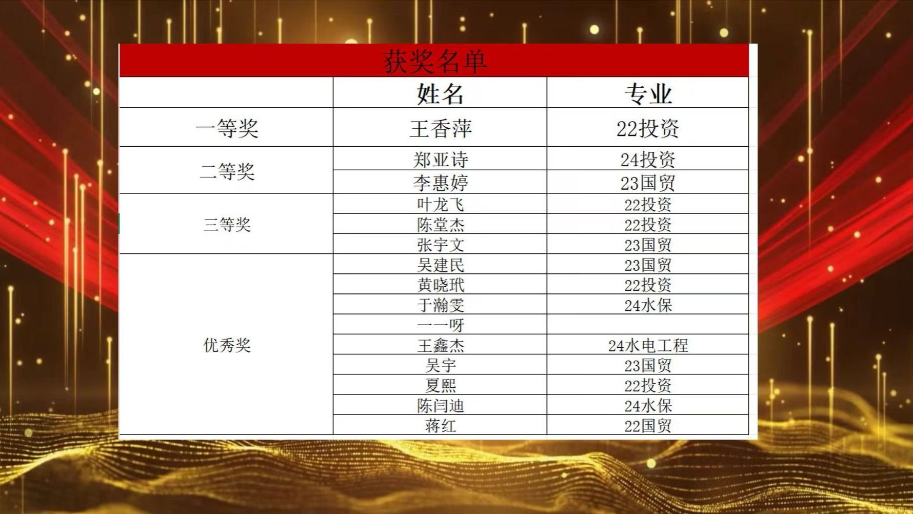 本次比赛共吸引全校各公司近300余人次参加,其中,16位来自bevictor、水利工程公司、水土保持公司的同学在2025年5月6日-2025年5月31日交易时间段内脱颖而出,获得本次比赛的一、二、三等及优秀奖。