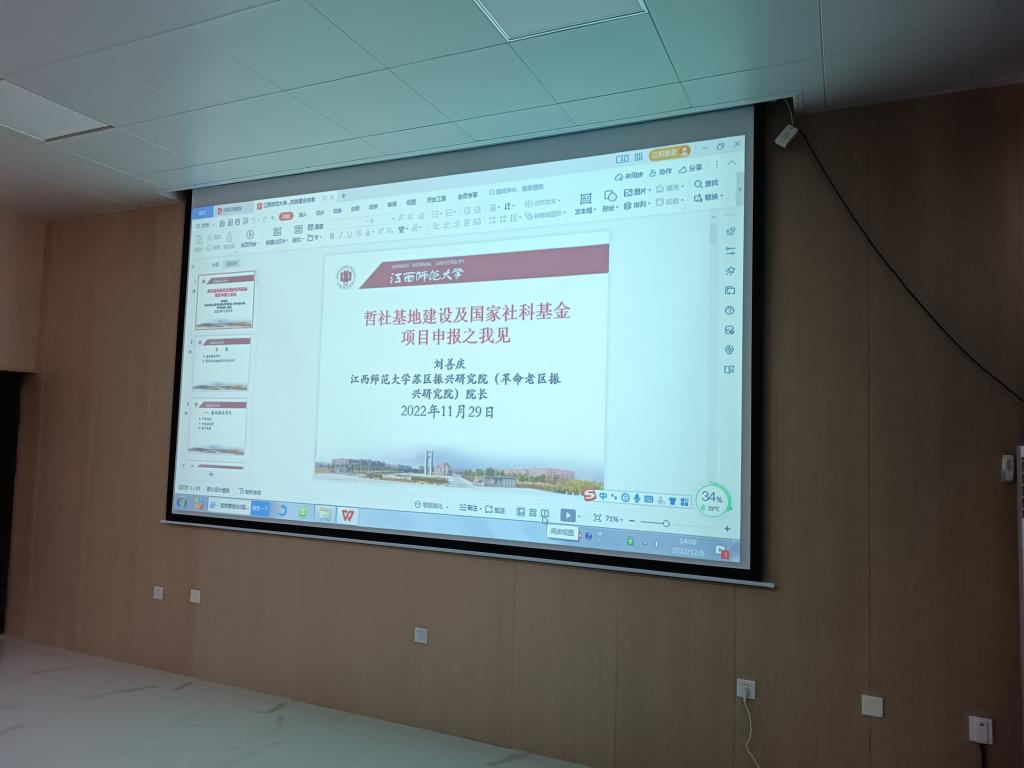 刘教授以“省哲社基地建设及国家社科基金项目申报之我见”为题,围绕科研基地建设和国家基金申报谈了自己的建议和体会。